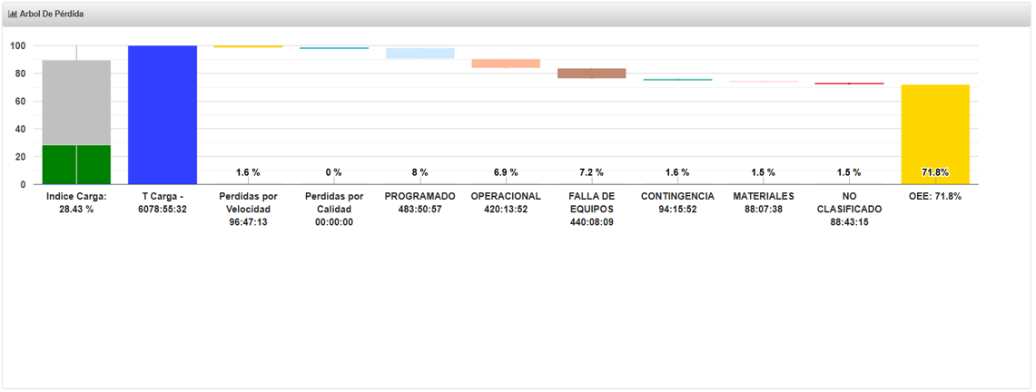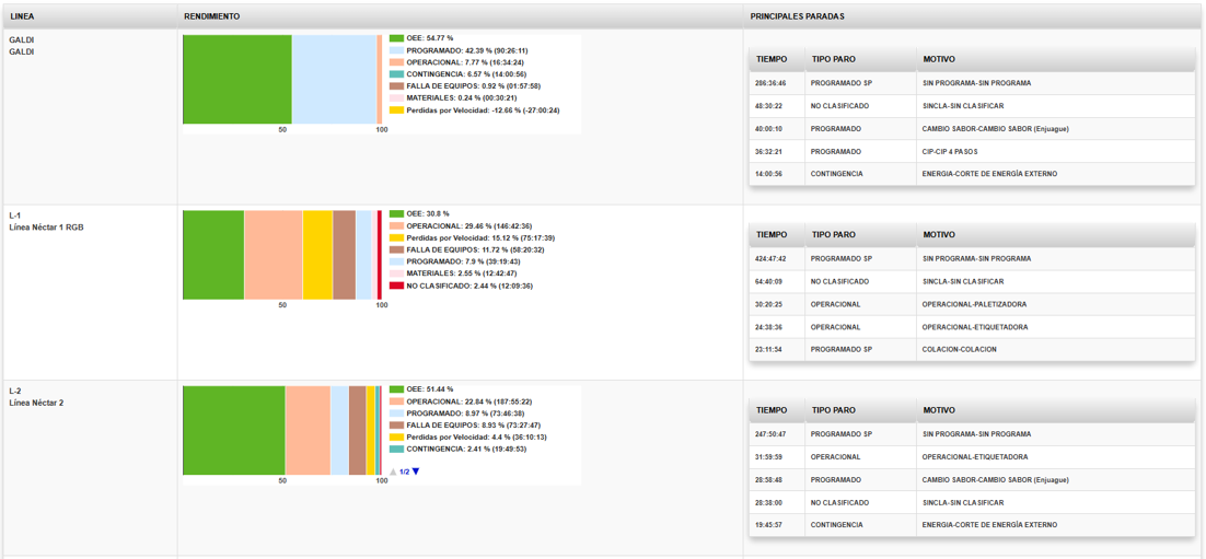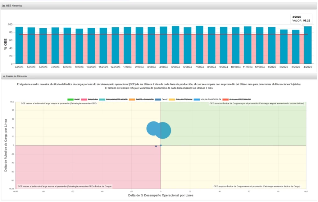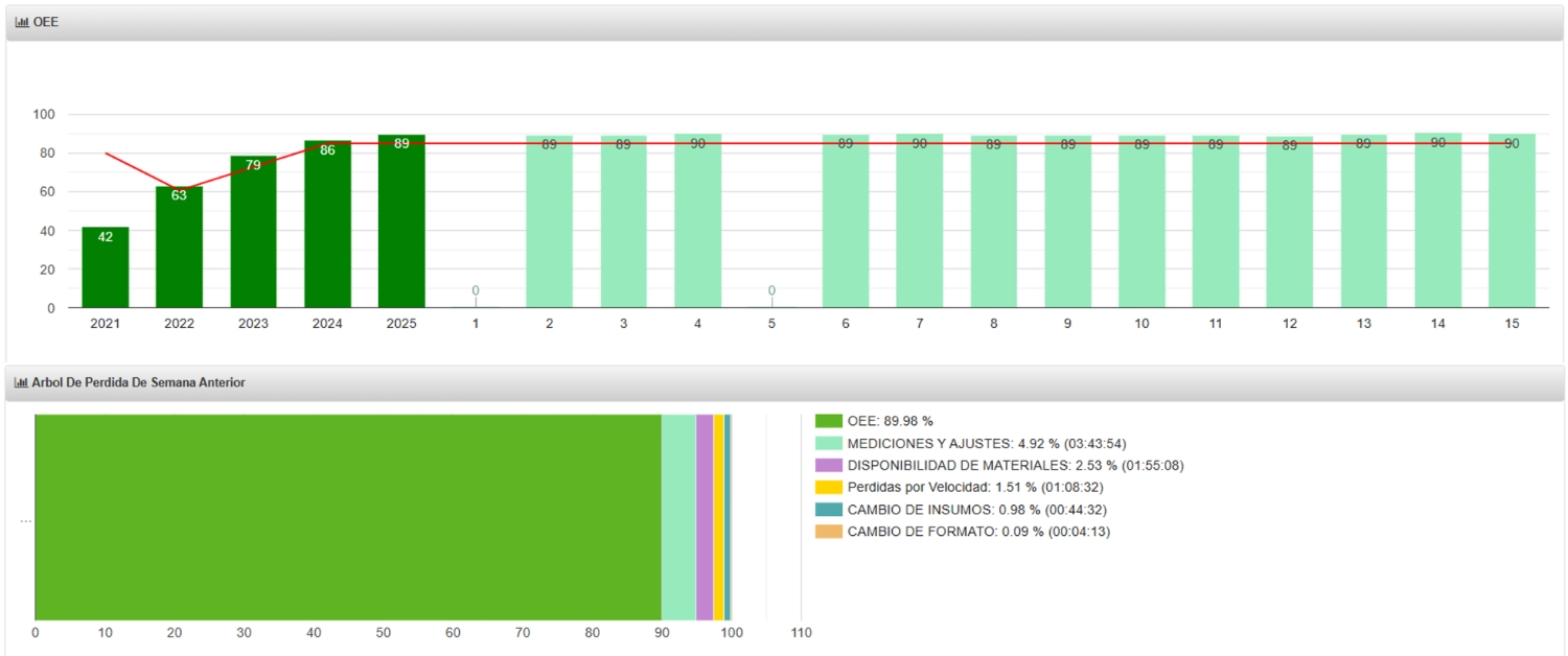 Diferentes visualizaciones de reportes e informes con indicadores de eficiencia, tiempos de inactividad y detalle de pérdidas de detenciones, velocidad y calidad para lograr un aumento de la eficiencia sostenible.